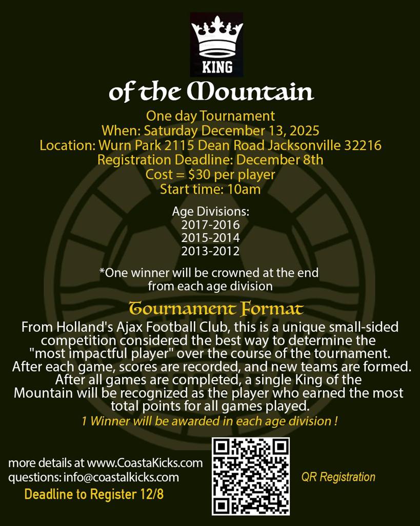 From Holland's Ajax Football Club, this is a unique small-sided competition considered the best way to determine the "most impactful player" over the course of the tournament. After each game, scores are recorded, and new teams are formed.After all games are completed, a single King of the Mountain will be recognized as the player who earned the most total points for all games played.1 Winner will be awarded in each age division !